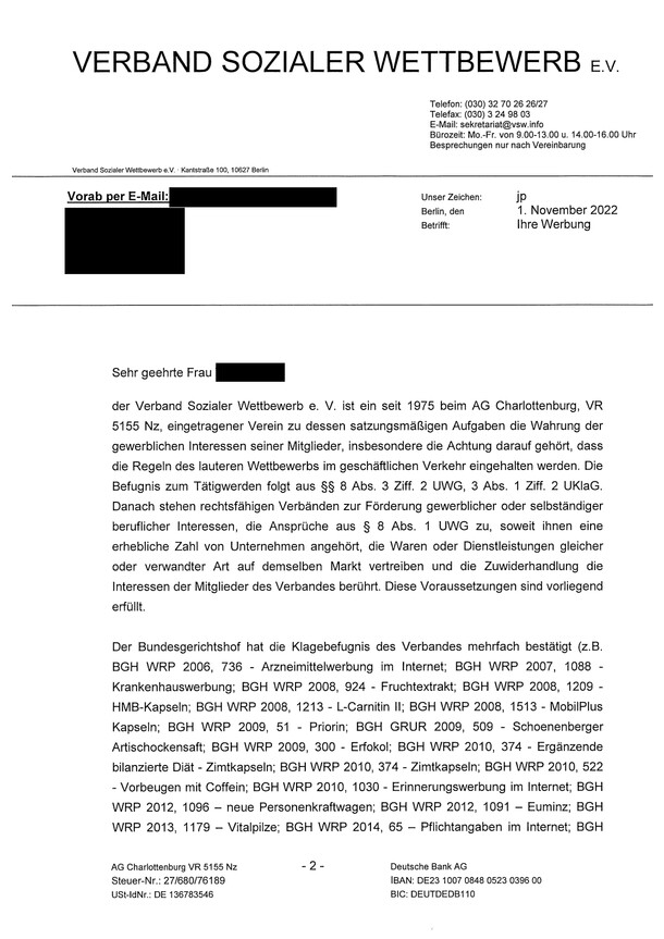 Lawyer helps with Verband Sozialer Wettbewerb warning letter