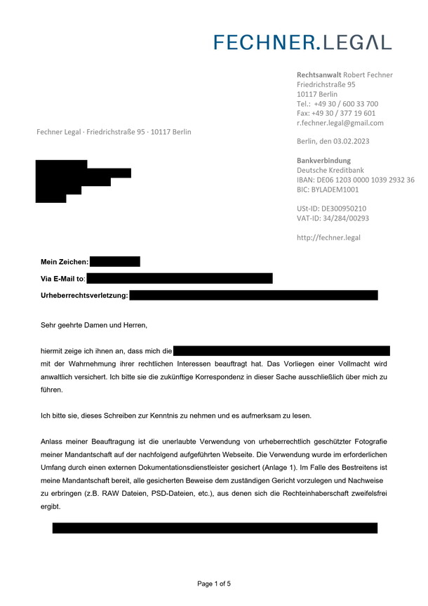 Fechner Legal is a law firm based in Berlin. The law firm is headed by lawyer Robert Fechner. In cooperation with the photo rights watchdog PhotoClaim, lawyer Robert Fechner issues cautionary warnings for various photographers whose photographs are cited without a license and without attribution.